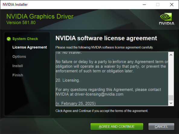 - Read the NVIDIA Software Agreement, then click the Agree and Continue.