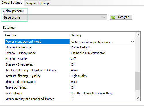 - While the Base Profile selected in the Global Presets, find the Power Management Mode and change it to Prefer Maximum Performance, as illustrated above.