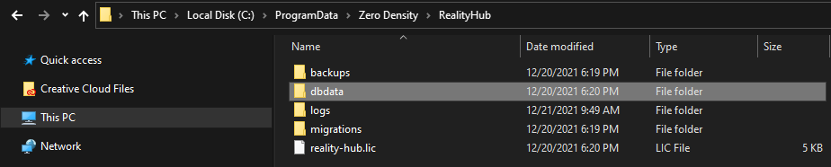 C:\ProgramData\Zero Density\RealityHub - Copy and paste the dbdata and backups folder to a different directory for restoring.