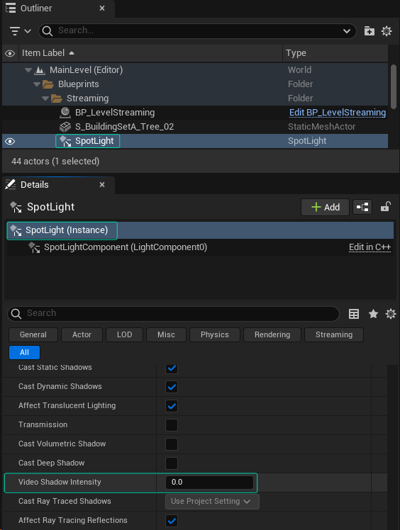 Video Shadow Intensity Property of Spot Light Actor Inside Reality Hub