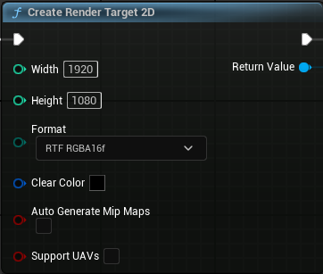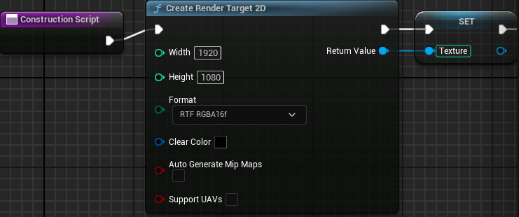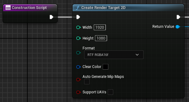 - Connect the Construction Script node's exec pin to the Create Render Target 2D node