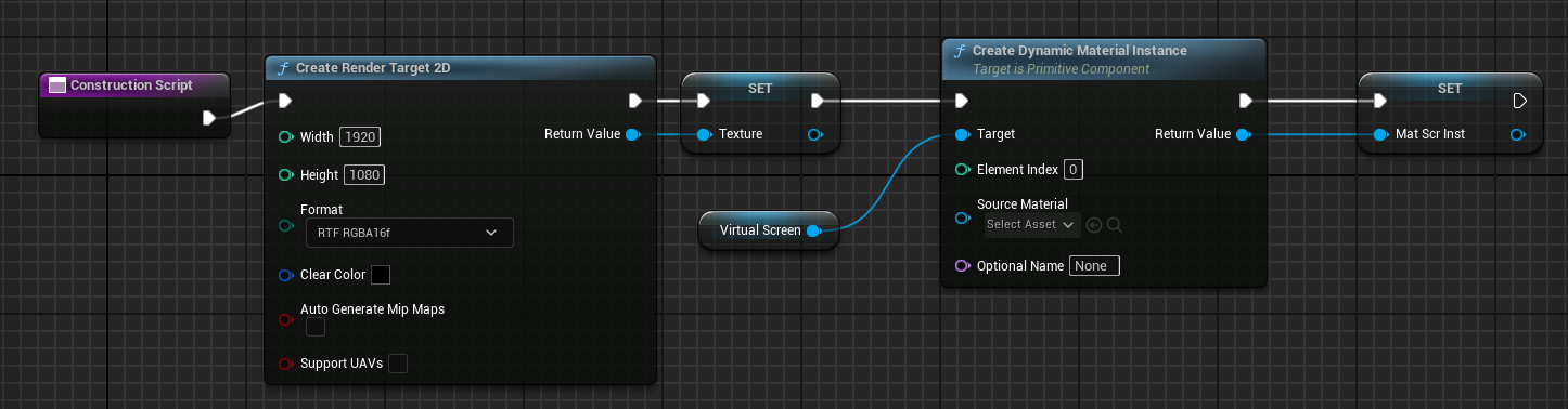 - Drag the "MatScrInst" variable onto the node graph using the Set option. Connect the execution pins at the end of the node graph, and link the Return Value pin to the Texture pin.