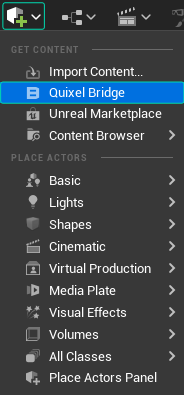 - Click on the Quick Add menu and select the Quixel Bridge.