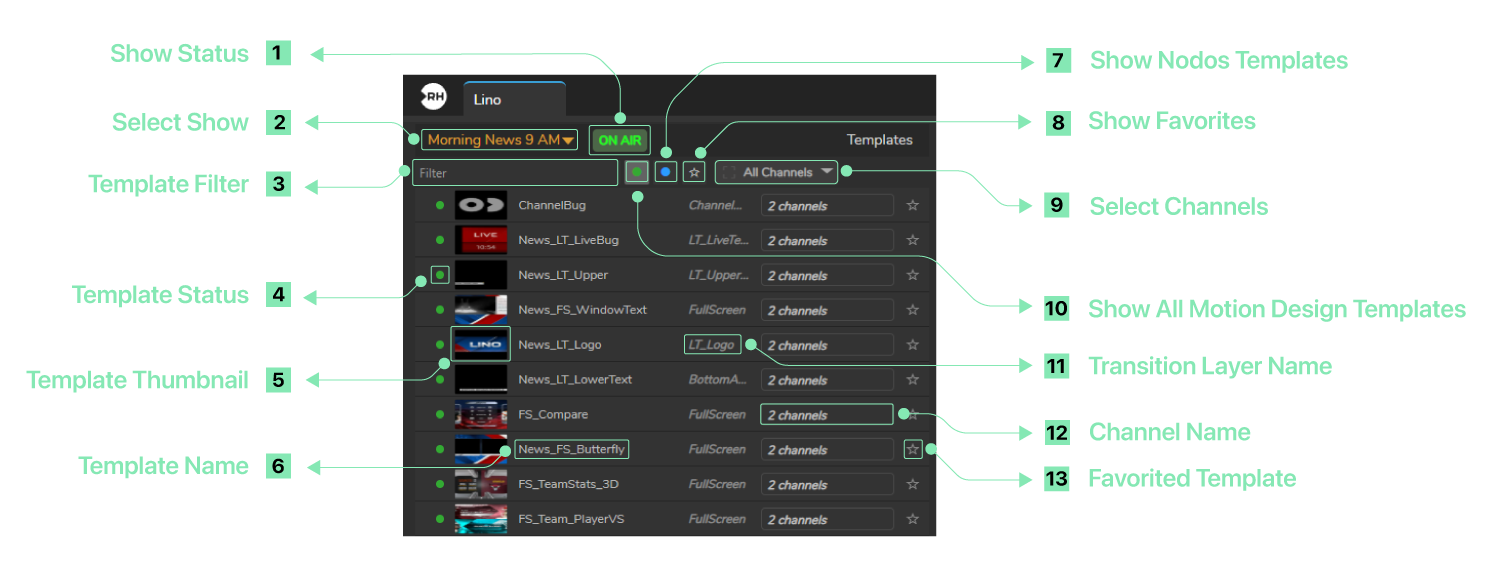 - Template Name: Name of the template in the list (e.g. “News_FS_Butterfly”, “ChannelBug”) for identification in the rundown.