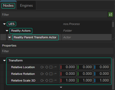 - Select the UE5 Node, go to Node Details Panel, expand the UE5 > Reality Actor > Reality Parent Transform Actor folders, as illustrated above.