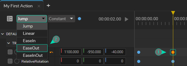 - Select the second keyframe of Relative Location, change its interpolation type from Jump to EaseOut. Repeat the same process for the Relative Rotation property.