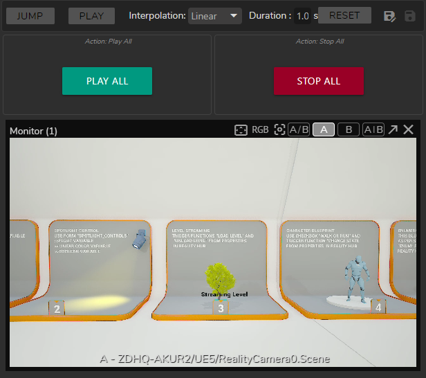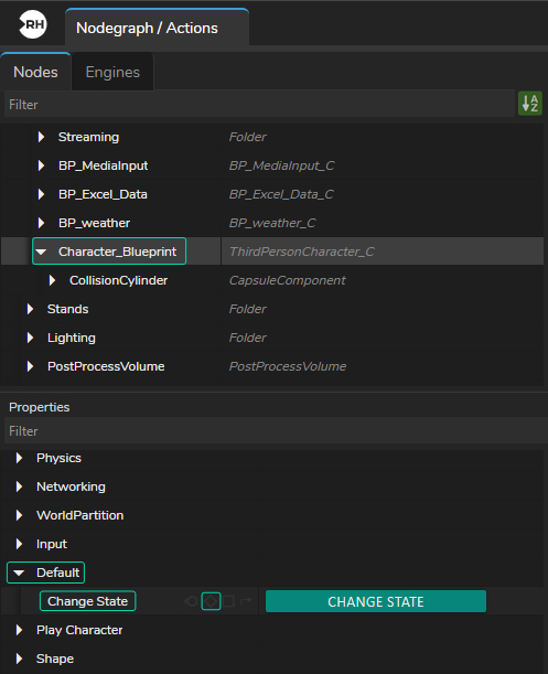 Main goal of this section is changing state of Character Blueprint, load a level with Level Streaming and change the color of Spotlight Control blueprint simultaneously with a single click.