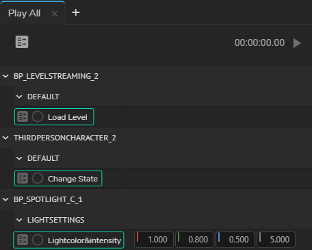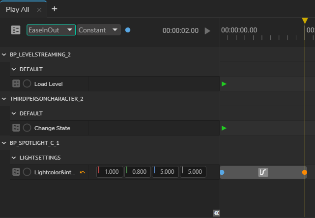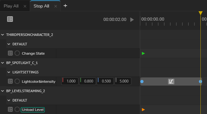 - Add Unload Level, Change State and Lightcolor&intensity properties to the Action Timeline.