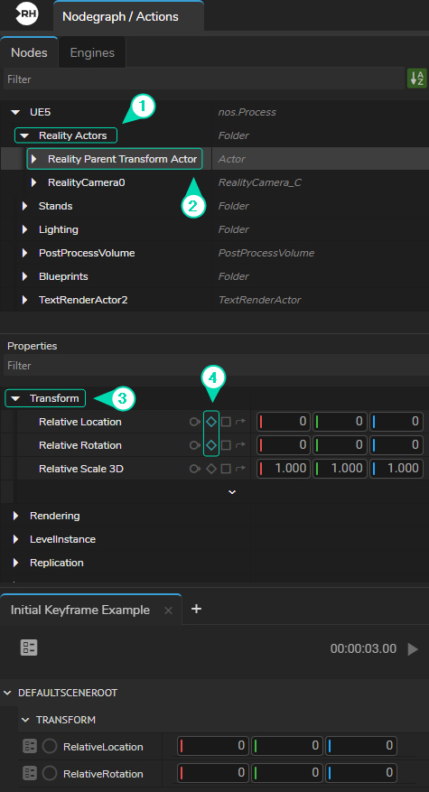 - Go to Properties section, expand the Transform property group, click on Add Timeline button for Relative Location and Relative Rotation properties. See also Node Property Toolset.