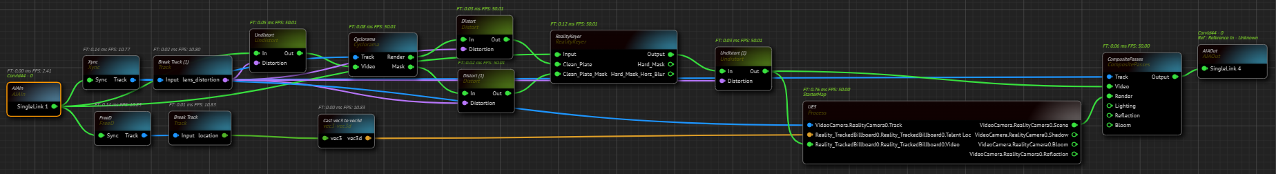 In the first stage, we create Portal Pins for commonly used connections, such as the SingleLink 1 output of the AJAIn node, the Track output pin of the Xync node, and the Lens Distortion output pin of the Break Track nodes.