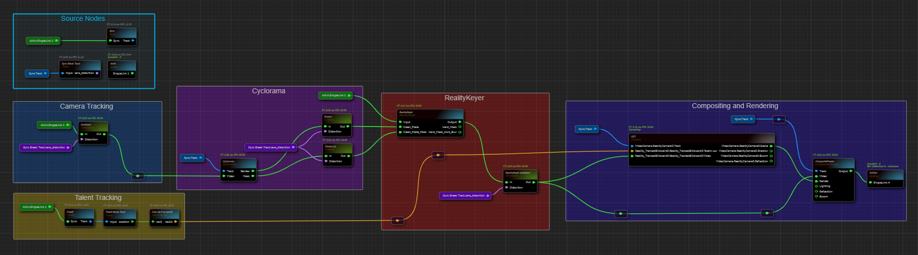In the second stage, we group various nodes using the Create Comment From Selection option and assign them meaningful names like Camera Tracking, Talent Tracking, Cyclorama, RealityKeyer, and Compositing and Rendering.