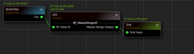 - Add a Sink node to the canvas and connect the Motion Design Output pin of the UE5 node to the Sink node’s input.
