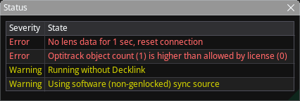 The Status panel is the first place to check if something doesn't work. The panel displays errors, warnings, and other status information from the running system.