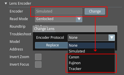 - In the Lens Encoder section, set Encoder Protocol as Tracker for FreeD trackers (such as PTZ), and to Canon or Fujinon depending on your lens for TrackBody trackers.
