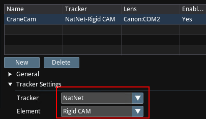 - In the Tracker Settings section, set the Tracker that you created in the previous step, and set the element accordingly. FreeD streams carry only one tracked element, whereas NatNet can carry multiple tracked elements.